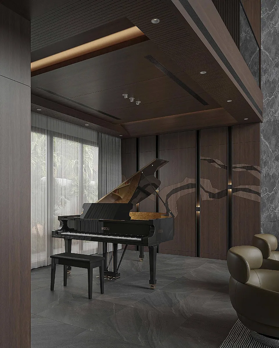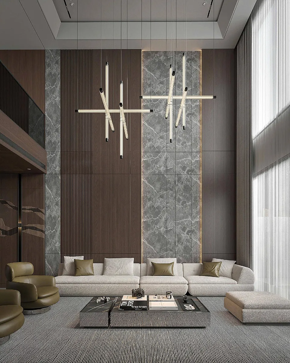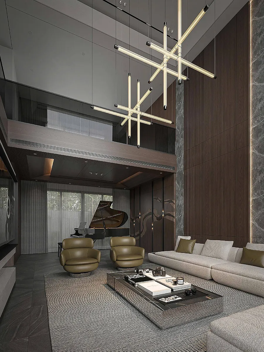 Để hiện thực hóa điều đó, phong cách Modern Luxury đã được lựa chọn làm kim chỉ nam. Chúng tôi khước từ những chi tiết rườm rà, thay vào đó tập trung vào chất cảm của vật liệu thượng hạng. Sự hiện diện của mặt đá tự nhiên nguyên vân nhập khẩu Brazil, các dải kim loại mạ PVD vàng bóng bẩy và hệ vách ốp gỗ công nghiệp An Cường chất lượng cao mang đến một vẻ đẹp kiêu kỳ nhưng không hề phô trương.