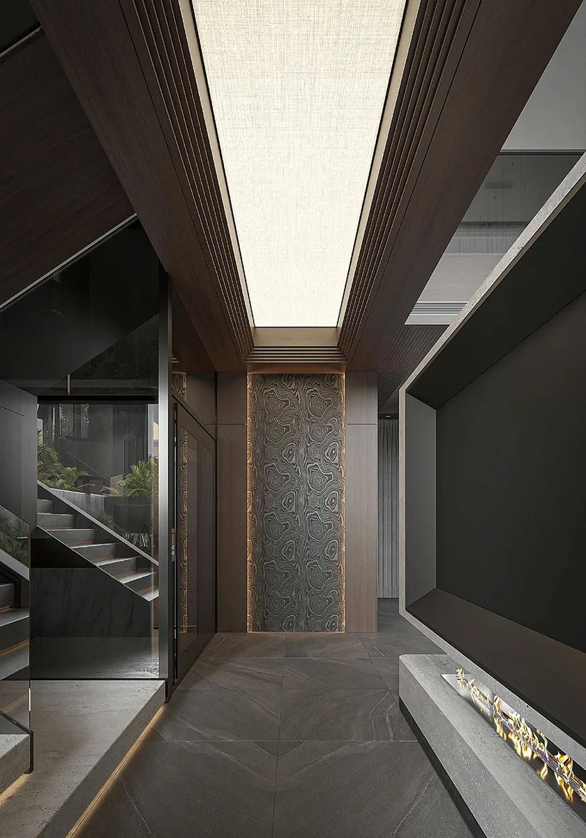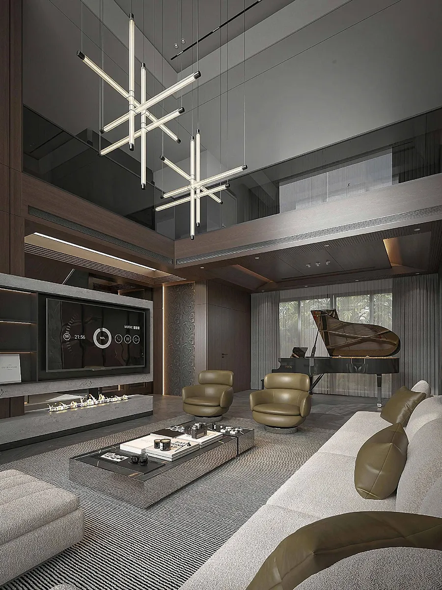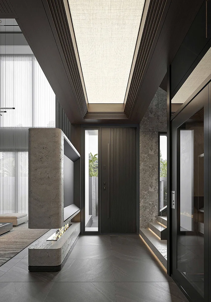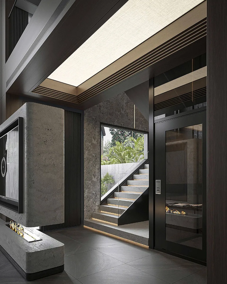 Nghệ thuật phân lớp ánh sáng (Layering light) được các KTS ứng dụng triệt để. Hệ thống đèn LED ray nam châm chạy dọc trần nhà kết hợp cùng đèn hắt khe tường tạo ra những vệt sáng đầy nghệ thuật khi màn đêm buông xuống. Khu vực bếp với bàn đảo trung tâm ốp đá nguyên khối trở thành trái tim của ngôi nhà, nơi mọi người quây quần trong một không gian tràn ngập ánh sáng từ hệ cửa kính kịch trần cỡ lớn.