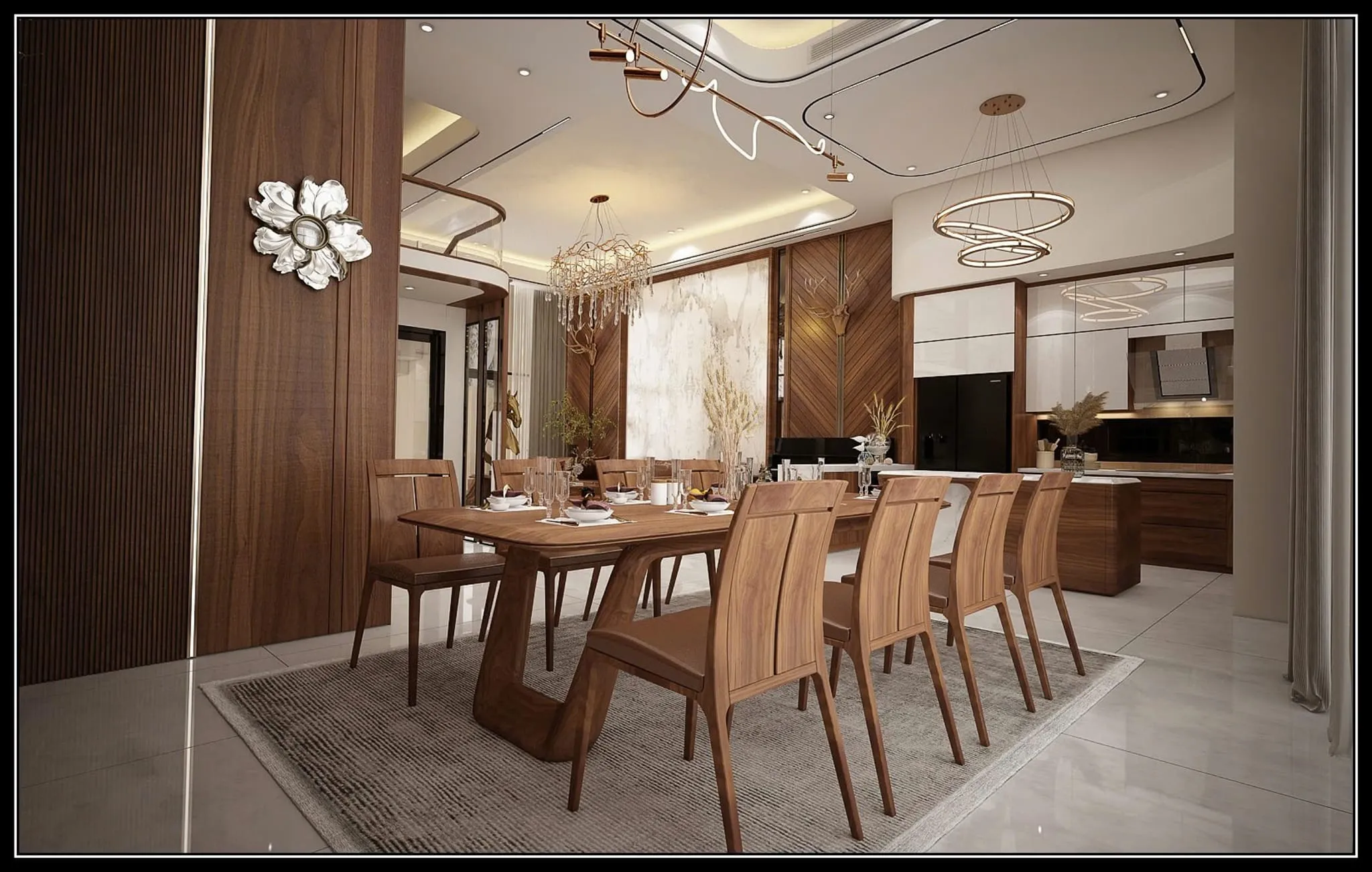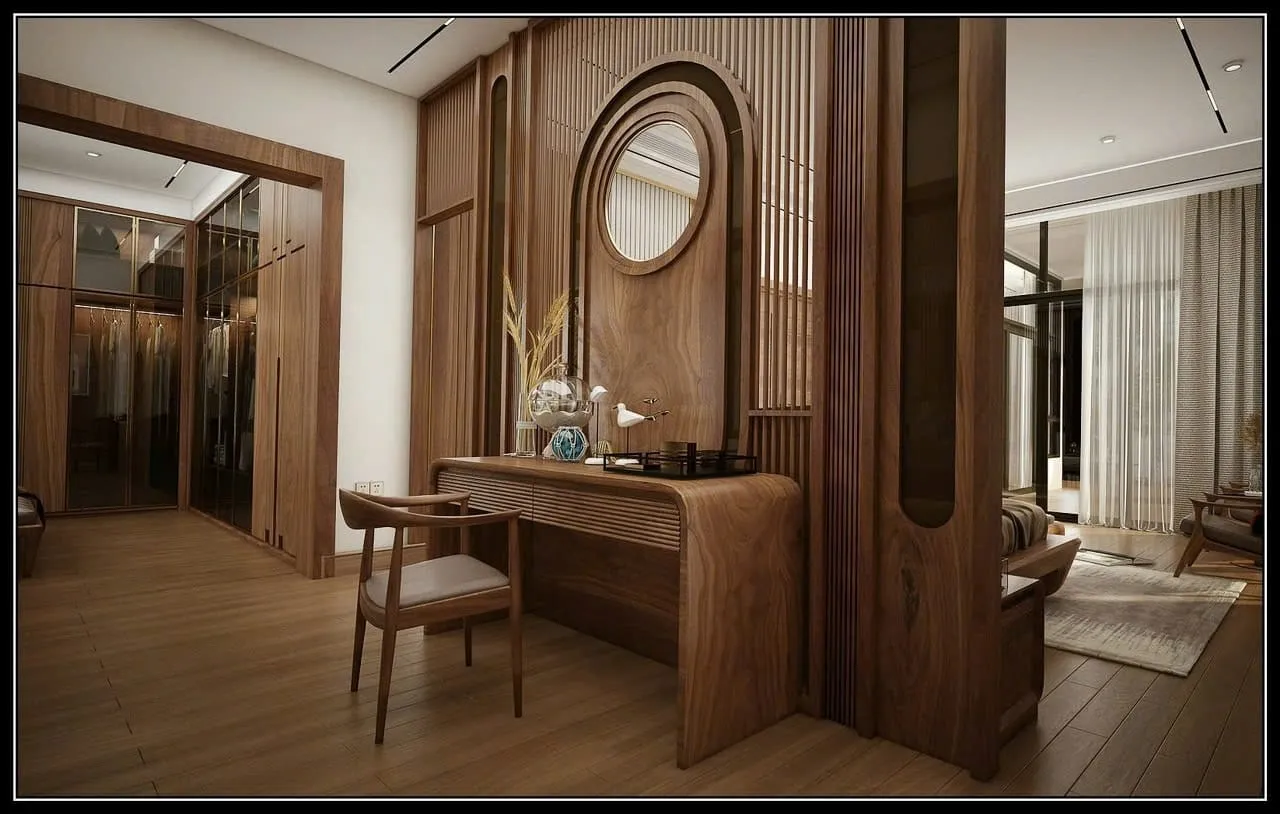 Thiết kế loại bỏ hoàn toàn các chi tiết rườm rà, đồ trang trí dư thừa và những góc cạnh sắc nhọn. Thay vào đó là những mảng khối phẳng phiu, các đường nét bo tròn mềm mại và bảng màu trung tính xoay quanh sắc trắng, be và vân gỗ sáng. Sử dụng toàn bộ vật liệu gỗ Sồi Nga nhập khẩu cao cấp, không gian toát lên vẻ đẹp thanh khiết, gần gũi và mộc mạc nhất có thể.