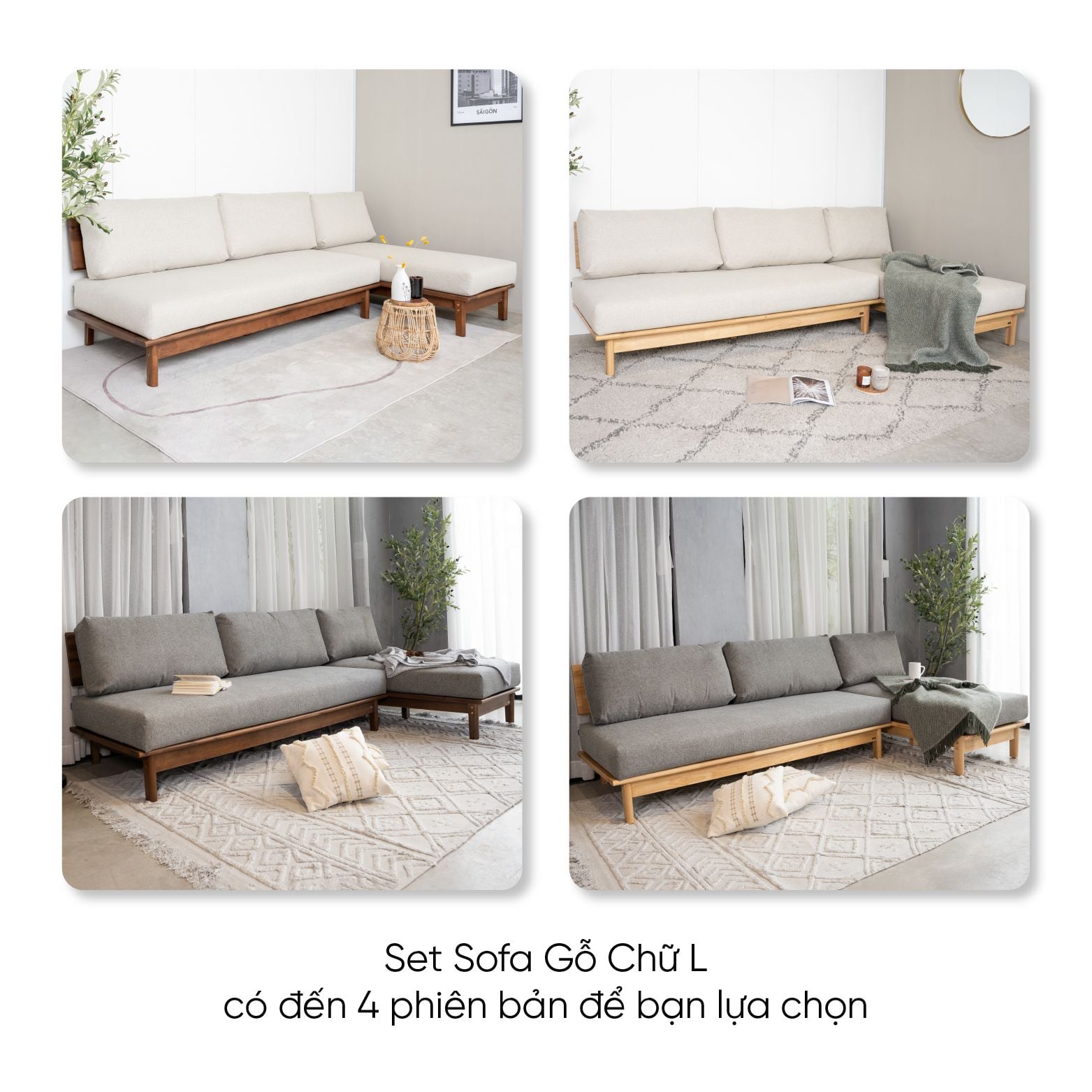 Khung ghế sofa, sofa góc và tủ kệ tv được làm bằng gỗ cao su tự nhiên đảm bảo vệ độ chắc chắn cao, chống công vênh, mối mọt.