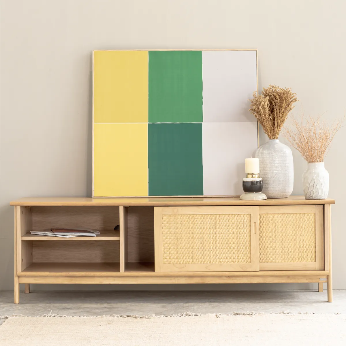 Cửa tủ sử dụng chất liệu mây tre đan truyền thống đã qua xử lý có khả năng chống mối mọt, mang lại tổng thể thiết kế vừa hiện đại vừa mộc mạc và tạo cảm giác cho người dùng tự nhiên, gần gũi với thiên nhiên hơn.