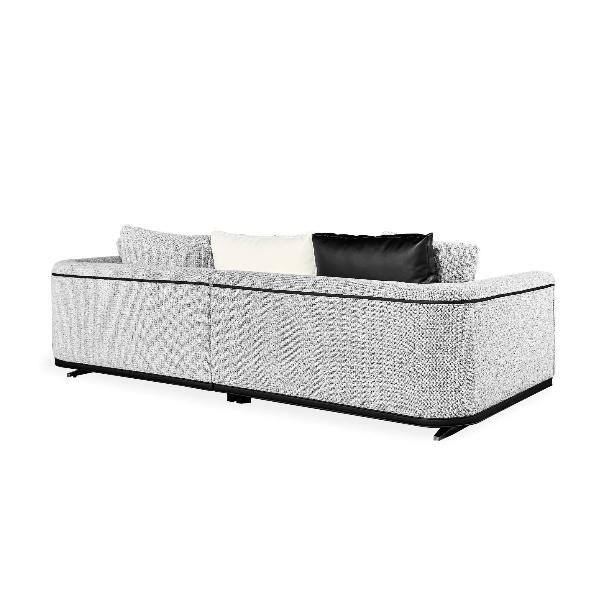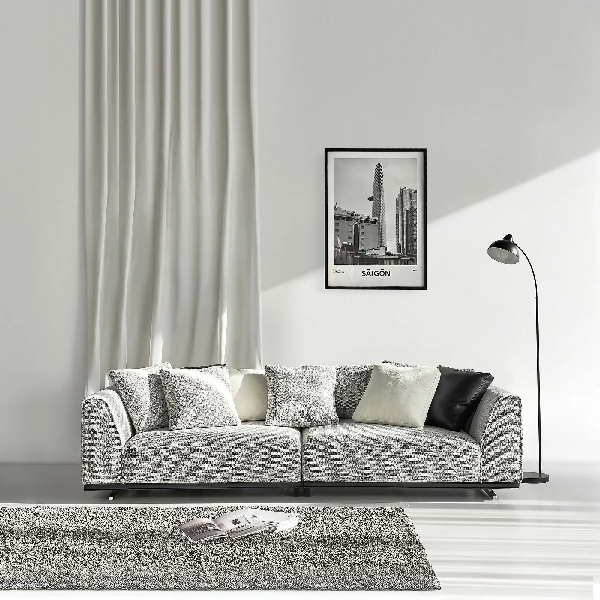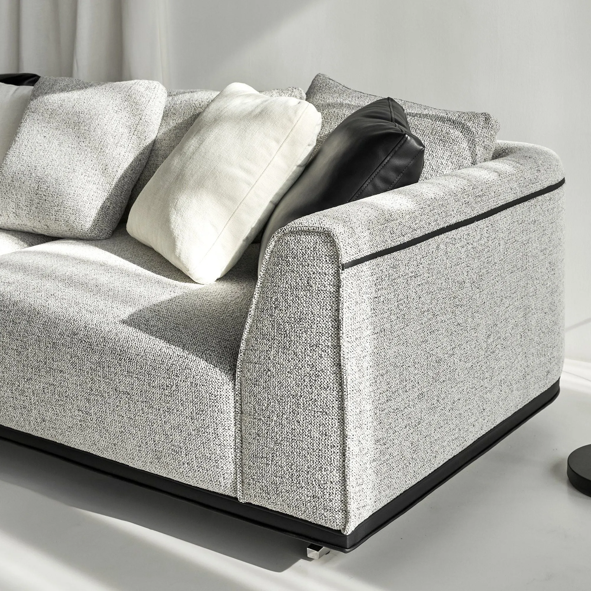Sự kết hợp hài hòa giữa vải và da, giữa các gam màu trắng, xám và đen, không chỉ làm tăng tính tiện nghi mà còn góp phần định hình phong cách cho không gian sống – một điểm nhấn thể hiện gu thẩm mỹ thời thượng và dễ dàng hòa hợp với nhiều phong cách nội thất khác nhau.