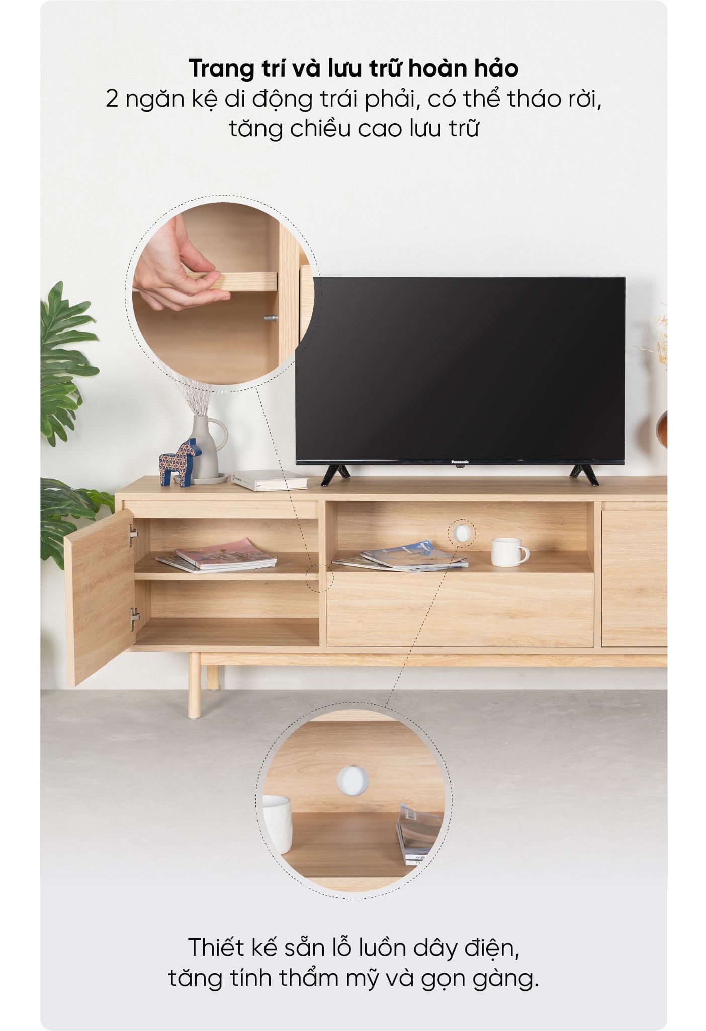 Thiết kế lỗ dây điện giúp dễ dàng luồng dây qua tủ tivi một cách dễ dàng mà không mất mẻ thẩm mỹ bởi chi tiết dây điện rờm rà.