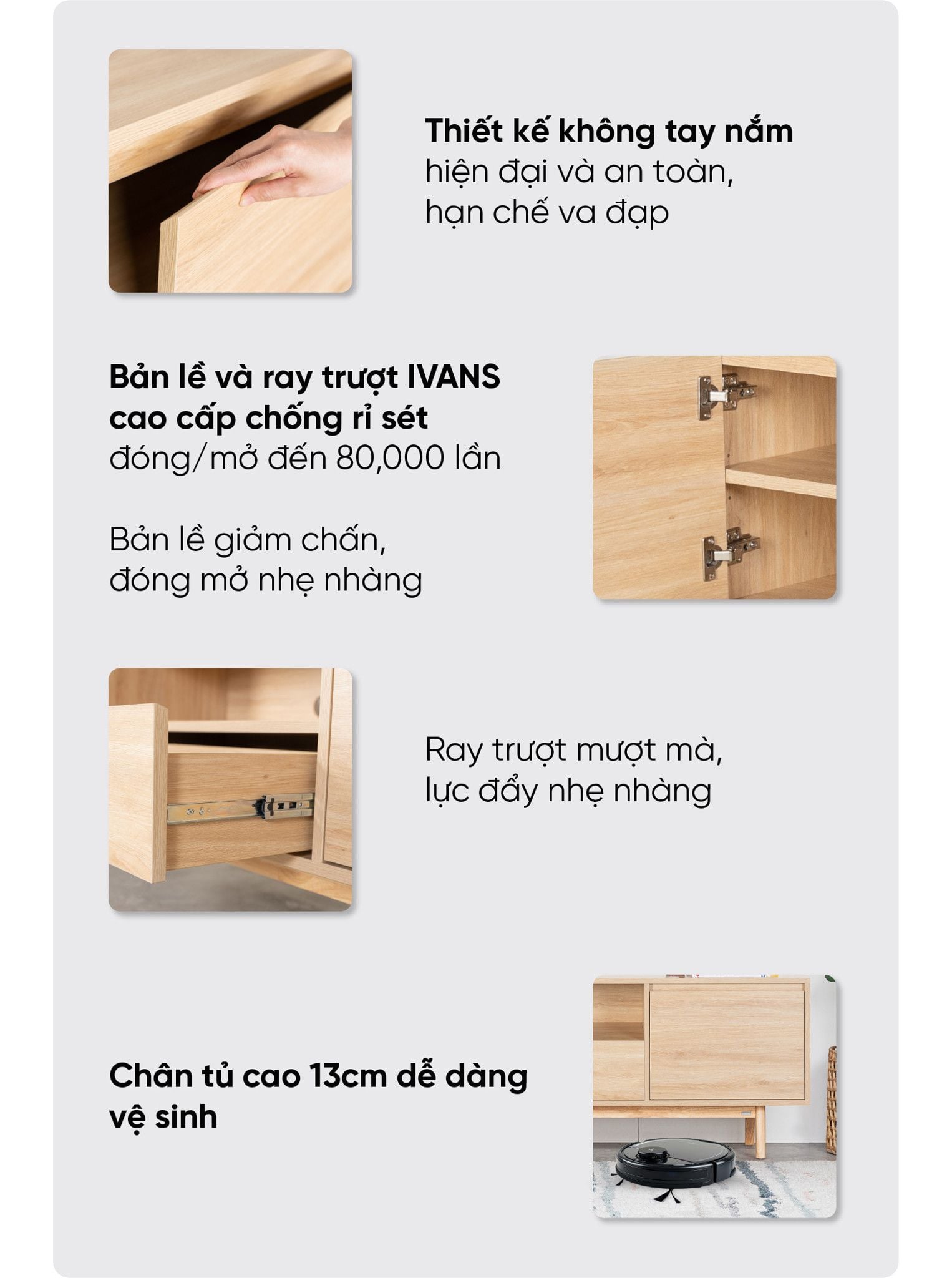 Tủ có độ cao 13 cm, có thể sử dụng máy hút bụi, robot hút bụi thông dụng. Có nút chân nhựa, giảm trầy sàn nhà