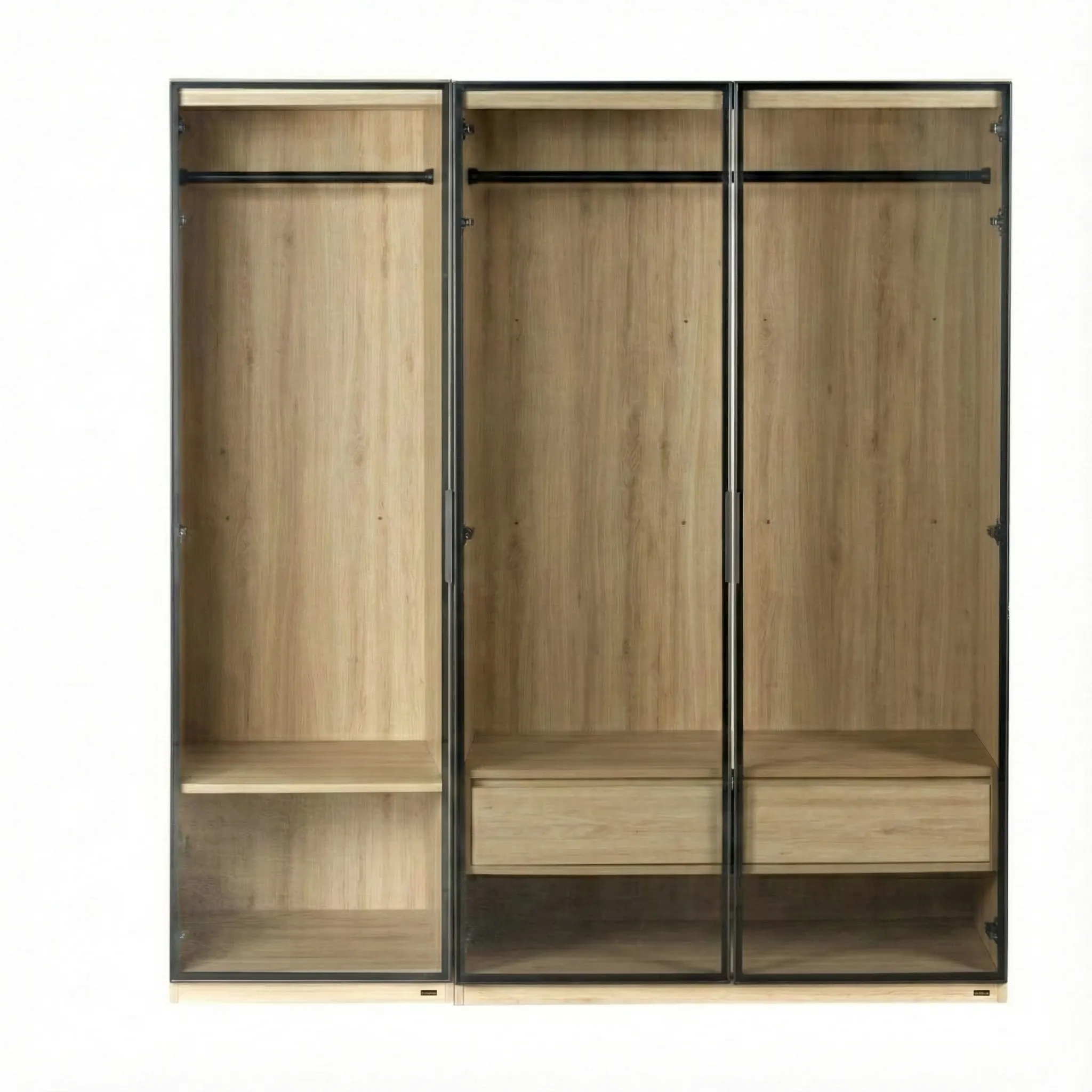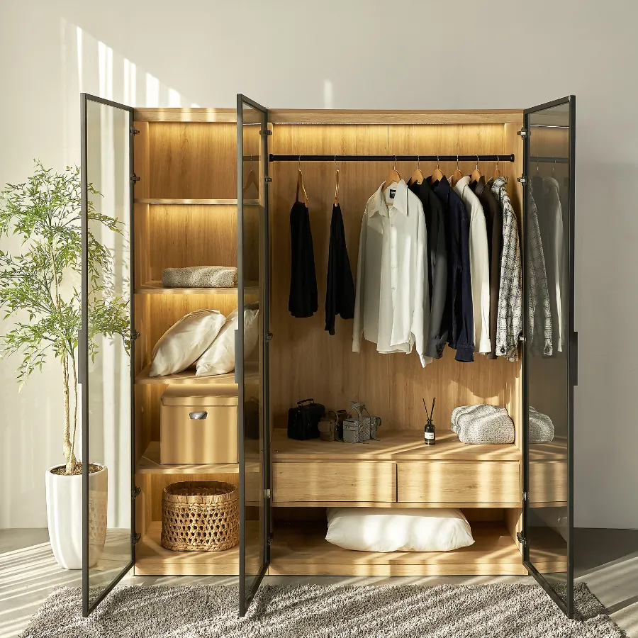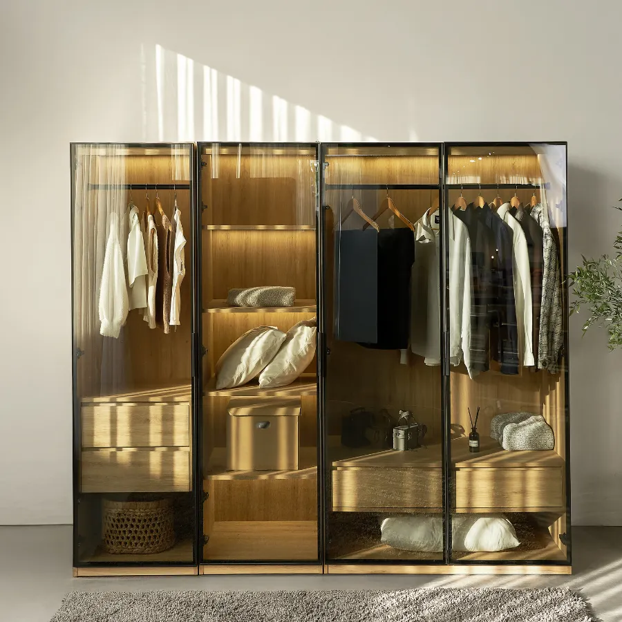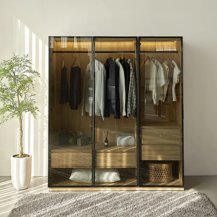 • Tạo thành hệ tủ 3 module liền mạch, vừa sang trọng nhờ kính xám khói, vừa tối ưu sức chứa cho mọi loại quần áo.