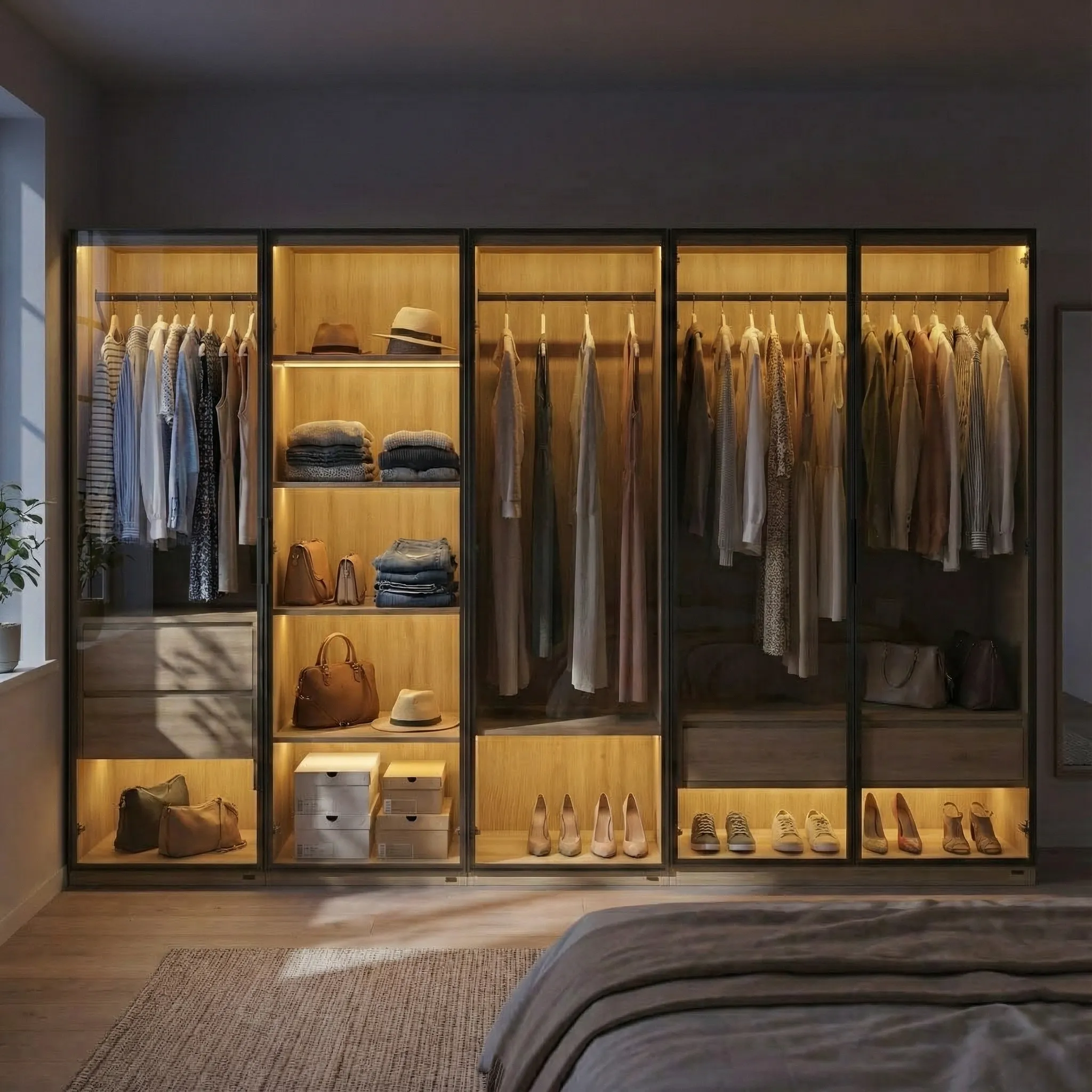 Combo tủ quần áo kính ASTRO mang đến giải pháp lưu trữ cao cấp cho phòng ngủ hiện đại, kết hợp giữa cánh kính xám khóikhung nhôm sơn tĩnh điện và hệ đèn Led tạo hiệu ứng ánh sáng sang trọng. Thiết kế module linh hoạt cho phép bạn tùy chỉnh theo nhu cầu và diện tích phòng – tối ưu công năng, nâng tầm thẩm mỹ và mang lại trải nghiệm sống đẳng cấp.