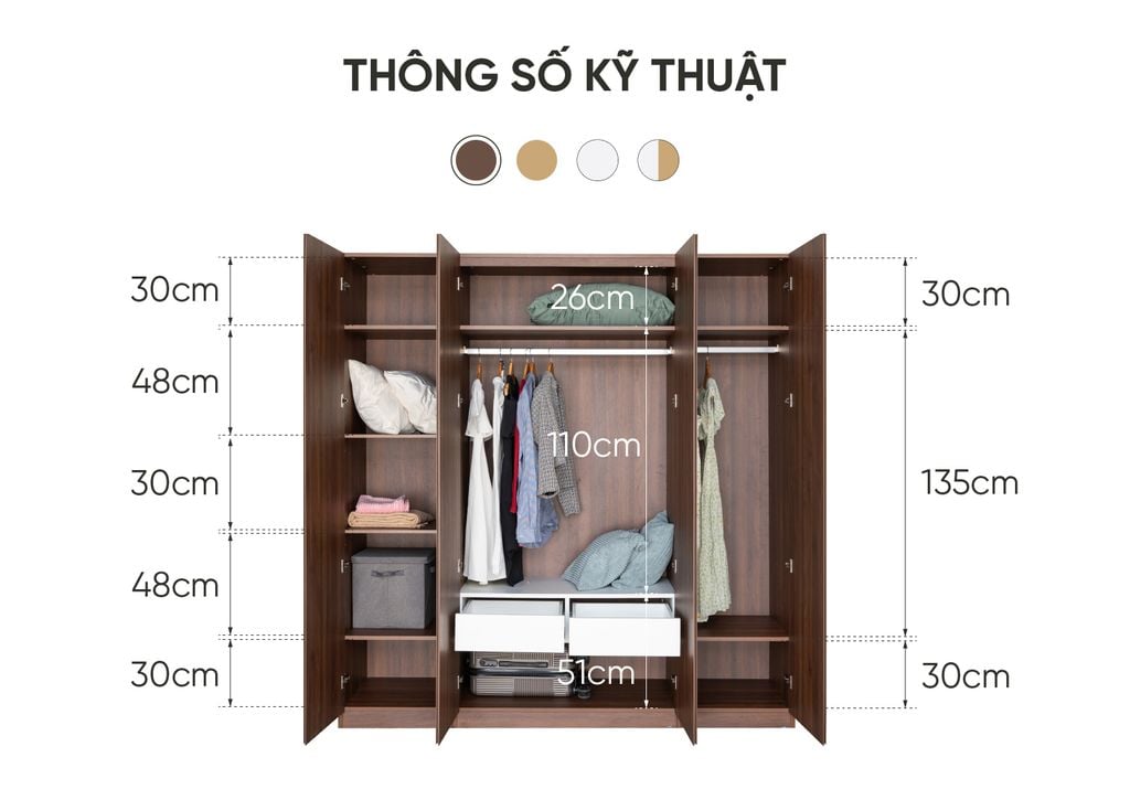 Set Tủ Quần Áo Gỗ NEWSUN VIENNA 4 Cánh 4 Màu
