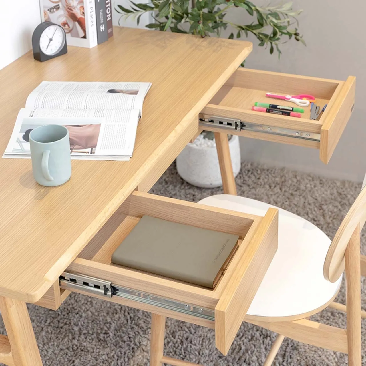 Bàn làm việc FYN sỡ hữu 2 hộc kéo nhỏ gọn với kích thước lọt lòng W230 X D400 X H70. Tuy nhỏ gọn nhưng vẫn mang lại tính tiện lợi cao khi kích thước có thể bỏ vừa giấy a4, ipad, laptop 14 in,… vô cùng tiện lợi giúp bạn có thể kéo hộc ra lấy đồ mà không cần phải di chuyển. Bên cạnh đó, hộc bàn có thể kéo ra tối đa, giúp bạn có thể đặt và lấy những món đồ sâu trong hộc.